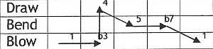 The tough thing with learning an alternate tuning is mastering the new breath and bending patterns. PHRASE MAPS can help speed the process, because they give clear visual reinforcement to what’s happening with the harp in your mouth. They simply involve making lines between cells in a tuning table, to indicate the path your mouth takes and the breath changes and bends involved.