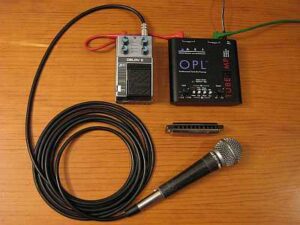 The delay pedal connects to on OPL preamp, shown here. The preamp gives a nicer sound to the harmonica, and also allows you to adjust your volume level on stage. Be sure not to make sudden big changes, otherwise the sound person may remove you from the mix entirely..