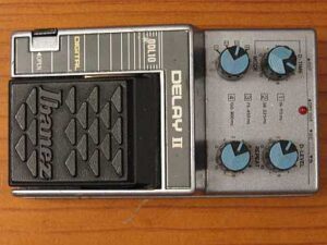 I use a delay pedal, shown here, to improve the sound of the harmonica. This is perhaps the most important effect for harmonica players, and is often the only one you really need. This setup has an old Ibanez Delay pedal, however many other manufacturers make delay pedals as well.