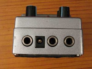 This photo shows the end of the delay pedal. The small hole is for a DC power adaptor (not shown). It is important to have simple sound equipment, which is quick to set up, as bands often have little time on stage to get ready before playing. The other three holes are input, output (with delay), and output with no delay.